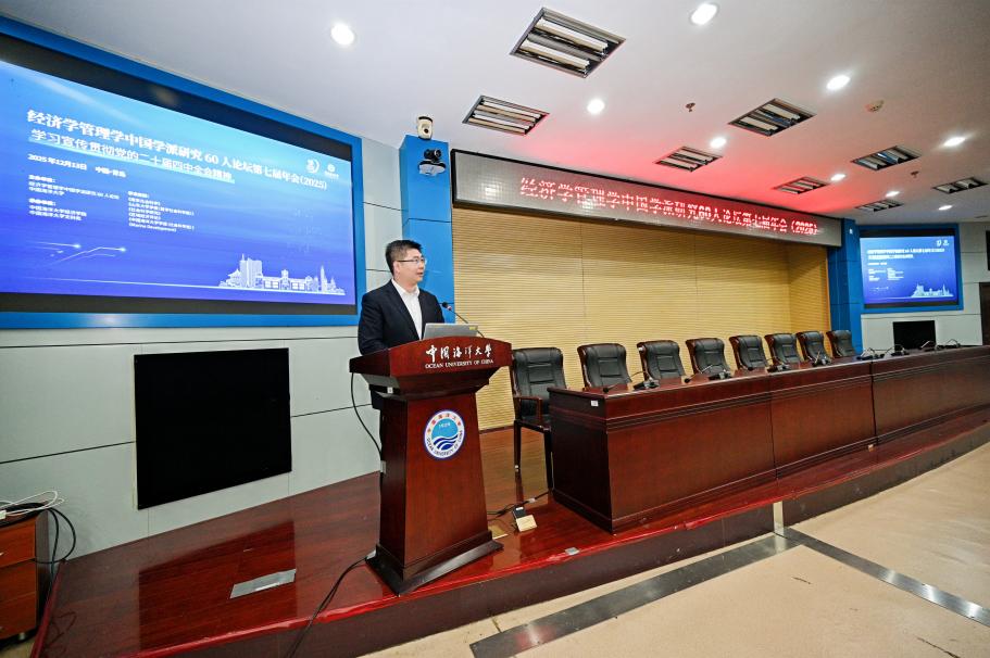 2025年12月13日,经济学管理学中国学派研究60人论坛第七届年会在中国海洋大学隆重举行。本届年会以“深入学习贯彻党的二十届四中全会精神”为主题,由经济学管理学中国学派研究60人论坛秘书处与中国海洋大学联合主办,中国海洋大学文科处与经济学院共同承办。来自全国数十所高校、科研院所、学术期刊及企业界的顶尖专家学者齐聚一堂。中国海洋大学文科处处长董跃教授代表主办方致辞,经济学院党委书记张念宾主持开幕式,院长赵昕主持主旨发言环节。