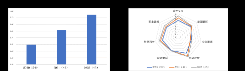 根据本课程思政教学目标,采用李克特10级量表,学生自评的方式测算各项指标的达成度。如图4所示,近三年来,学生获得感整体得分逐年提高,其中政治认同、科学精神和职业素养的自我满意度提升显著。
