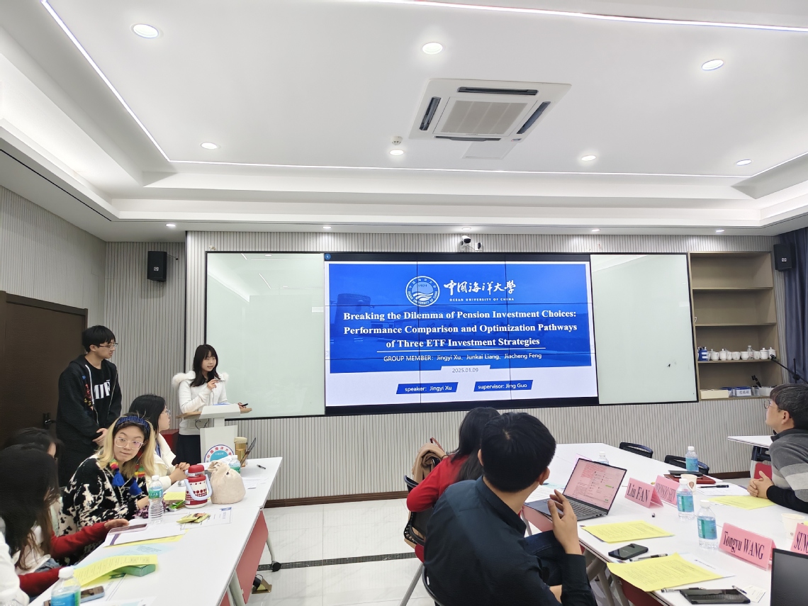 王宇嘉、孙佳玥、周佳文、彭嘉玥小组以 “The Role and Mechanism of ETFs in Individual Pension Plans”(ETF对第三养老支柱产业的作用及机理研究)为题,通过构建双向固定效应面板回归模型,探究ETF的持仓占比对个人养老基金表现的影响,并深入研究该过程中的调节因素及调节效应,进一步健全完整机制,为如何利用ETF优化个人养老基金资产配置提供启示。目前该研究成果已成功立项山东省SRDP项目。