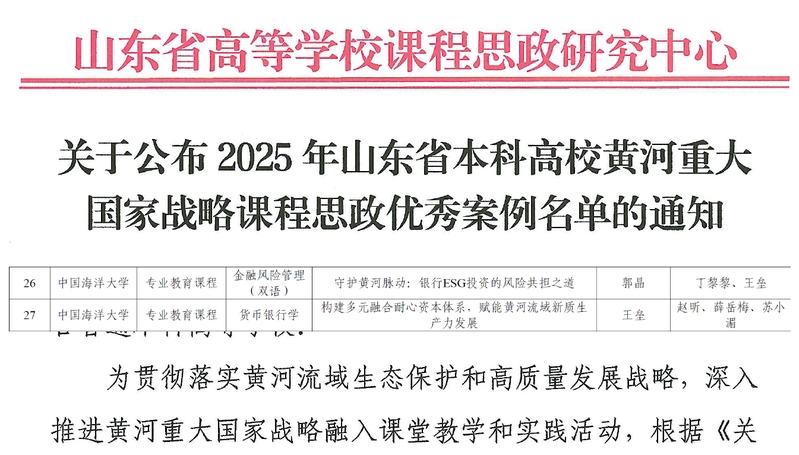 近日,山东省高等学校课程思政研究中心公布2025年山东省本科高校黄河重大国家战略课程思政优秀案例名单,中国海洋大学经济学院郭晶教授、王垒教授牵头的两项专业教育课程案例凭借鲜明的战略导向、深厚的思政内涵与扎实的教学实践,成功入选优秀案例名单,为学院课程思政建设再添硕果。