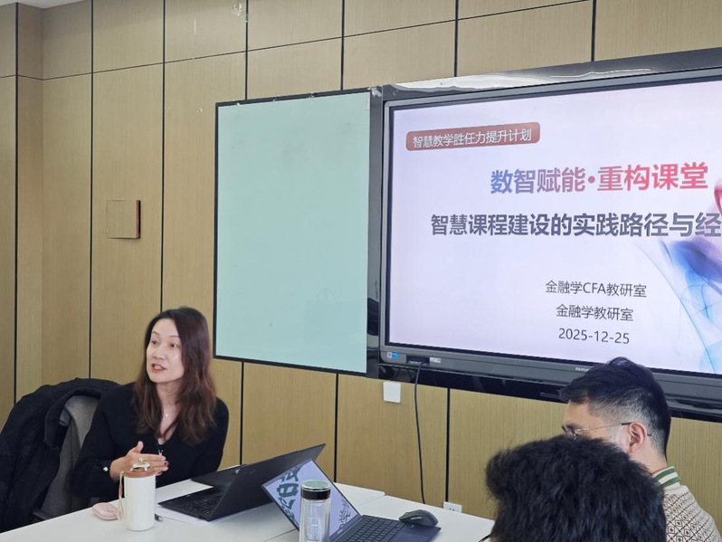 2025年12月25日,金融学CFA教研室与金融学教研室在经济学院经济三会议室联合举办智慧课程建设专题研讨会。本次研讨会是经济学院“智慧教学胜任力提升计划”系列讲座之一,以“数智赋能·重构课堂——智慧课程建设的实践路径与经验总结”为主题,由金融学CFA教研室主任郭晶教授主讲,金融系相关教师参加研讨。