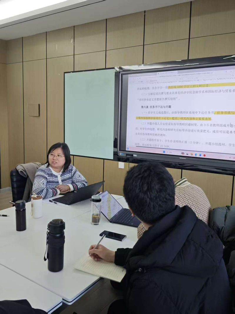 为精准落实学校《2025年春季学期本科教学督导工作纪要(51)》《本科教育教学审核评估整改教学档案专项检查专家组工作报告》等文件要求,全面提升教学质量与管理规范化水平,2025年12月25日,金融学教研室与金融学CFA教研室在经济学院经济三会议室联合举办教学规范专题学习会。本次学习会聚焦教学各环节的制度规范与实施要点,旨在引导教师系统掌握教学标准,持续提升教学专业素养。学习会由金融学教研室主任刘妍主持,金融系相关教师参加研讨。