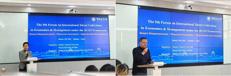 2026年1月9日,第五届 RCEP 框架下经管国际化人才培养研讨会暨本科生创新论坛在中国海洋大学经济学院成功举办。本次论坛以“数智赋能、金融创新与高质量发展”为主题,由中国海洋大学与国立韩巴大学联合主办,中国海洋大学经济学院承办。来自中韩两国高校的科研人员及学生代表30余人齐聚一堂,围绕数智技术赋能人才培养、金融创新实践以及高质量发展等议题展开深入交流与研讨。