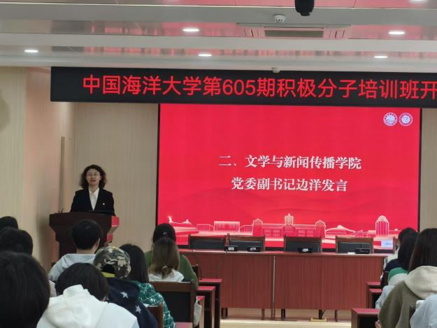 4月2日下午,中国海洋大学第605期入党积极分子培训班开班仪式在经济学院117室隆重举行。文学与新闻传播学院党委副书记、副院长边洋,经济学院专职辅导员孙明涵,文学与新闻传播学院专职辅导员李雨桐出席仪式,第605期全体入党积极分子参加本次开班仪式,仪式由李雨桐主持。